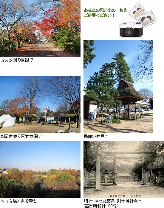@高岡古城公園内で撮影した写真 A高岡古城公園内を写した古い絵はがき 上記2点を募集します。写真・絵はがきの時代(年代)や、登場人物の有無は問いません。 家族の思い出の写真、お友達と写した写真、昔の遠足の写真、お花見のときの写真などはありませんか? |