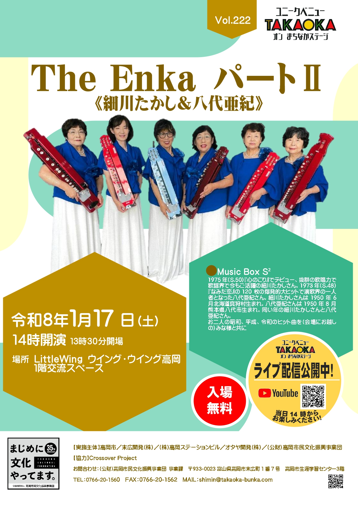事業課 TEL : 0766-20-1560 FAX : 0766-20-1562  E-MAIL : shimin@takaoka-bunka.com