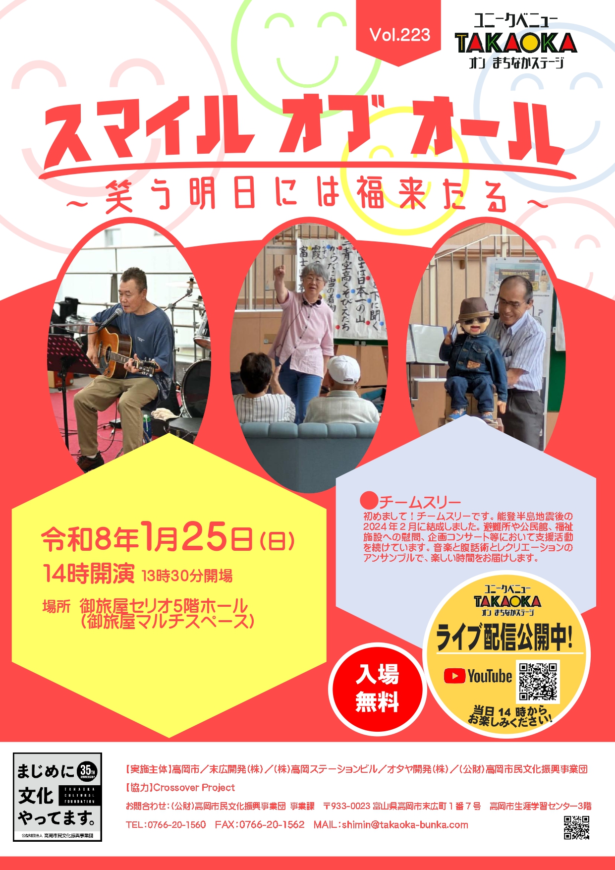 ユニークベニューTAKAOKA オン まちなかステージ 第223弾! VOL.223 スマイル オブ オール 〜笑う明日には福来たる〜 チケット情報 日時: 2026年1月25日 2:00 PM – 3:00 PM 会場: 御旅屋セリオ5階イベントスペース 出演: チームスリー 料金: 無料 主催: 実施主体/高岡市・末広開発㈱・㈱高岡ステーションビル・オタヤ開発㈱・(公財)高岡市民文化振興事業団 お問い合わせ: (公財)高岡市民文化振興事業団事業課 TEL:0766-20-1560
